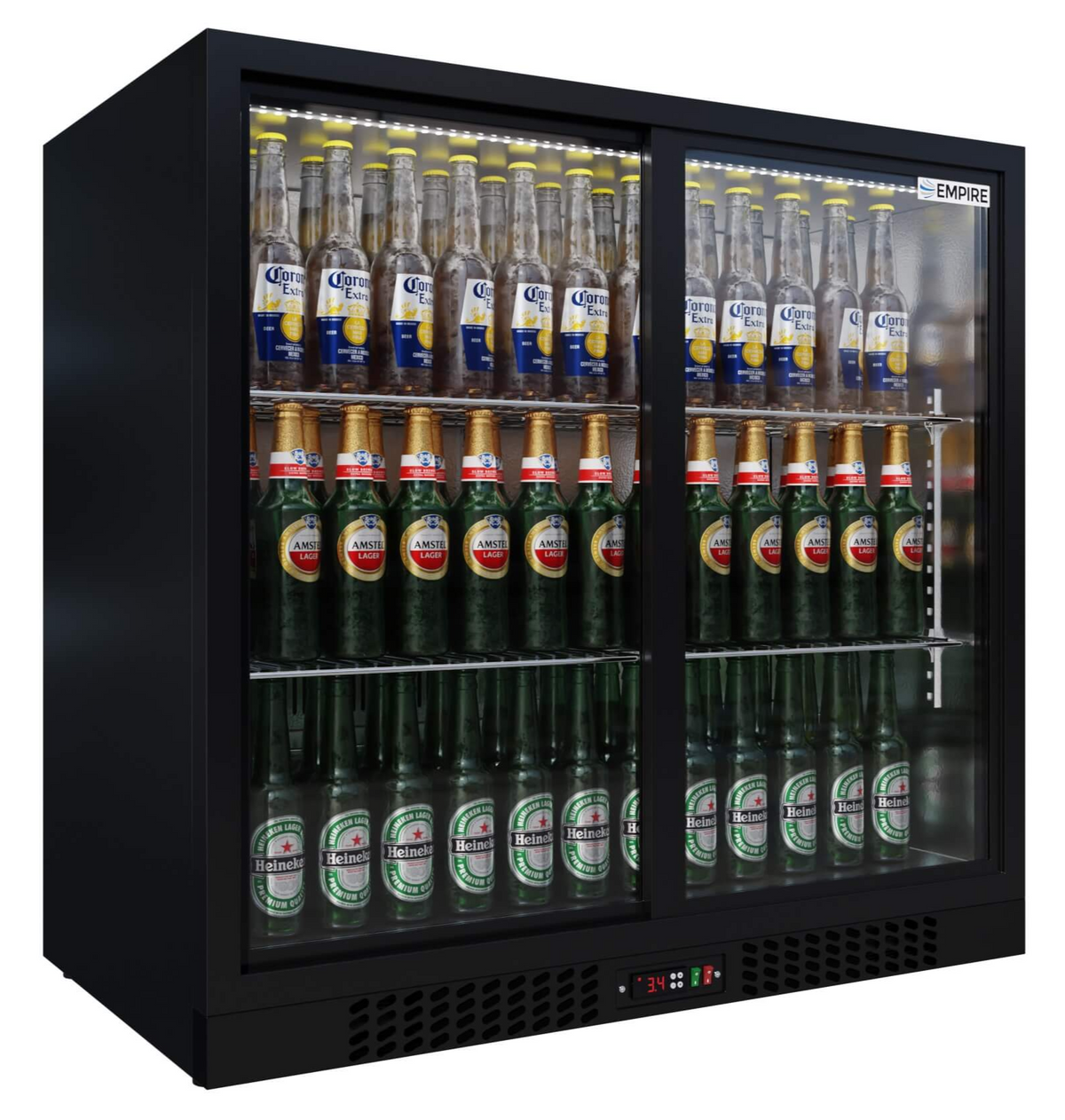 Updated for 2023 our new 5 Star customer rated double door back bar cooler. With an impressive C Energy rating the Empire double sliding door back bar chiller available in black or stainless steel with LED Lighting is perfect for keeping your best sellers chilled and ready at your disposal. With two large, clear doors, this multipurpose beer fridge comes with a range of useful features, including an integral temperature controller and auto defrost.