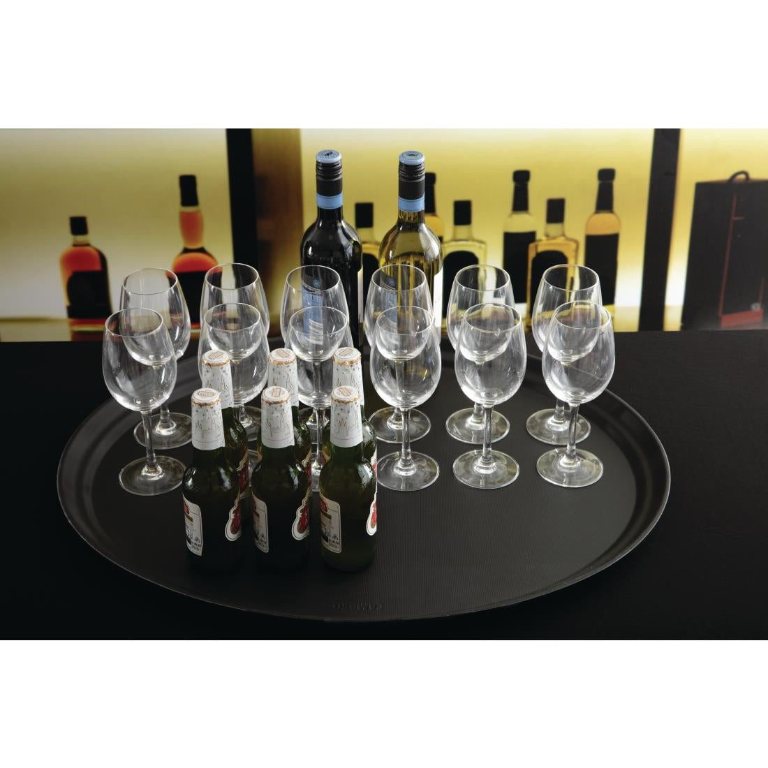 Make carrying large numbers of glasses, plates and bowls an effortless task, using the 600(W) x 560(D)mm black Cambro Camtread large fibreglass oval non-slip tray. The tray's non-slip coating keeps a firm grip of your glasses and crockery even when a little wet. As such, this tray prevents tableware from sliding to reduce the risk of dangerous and expensive breakages or wasted goods.
