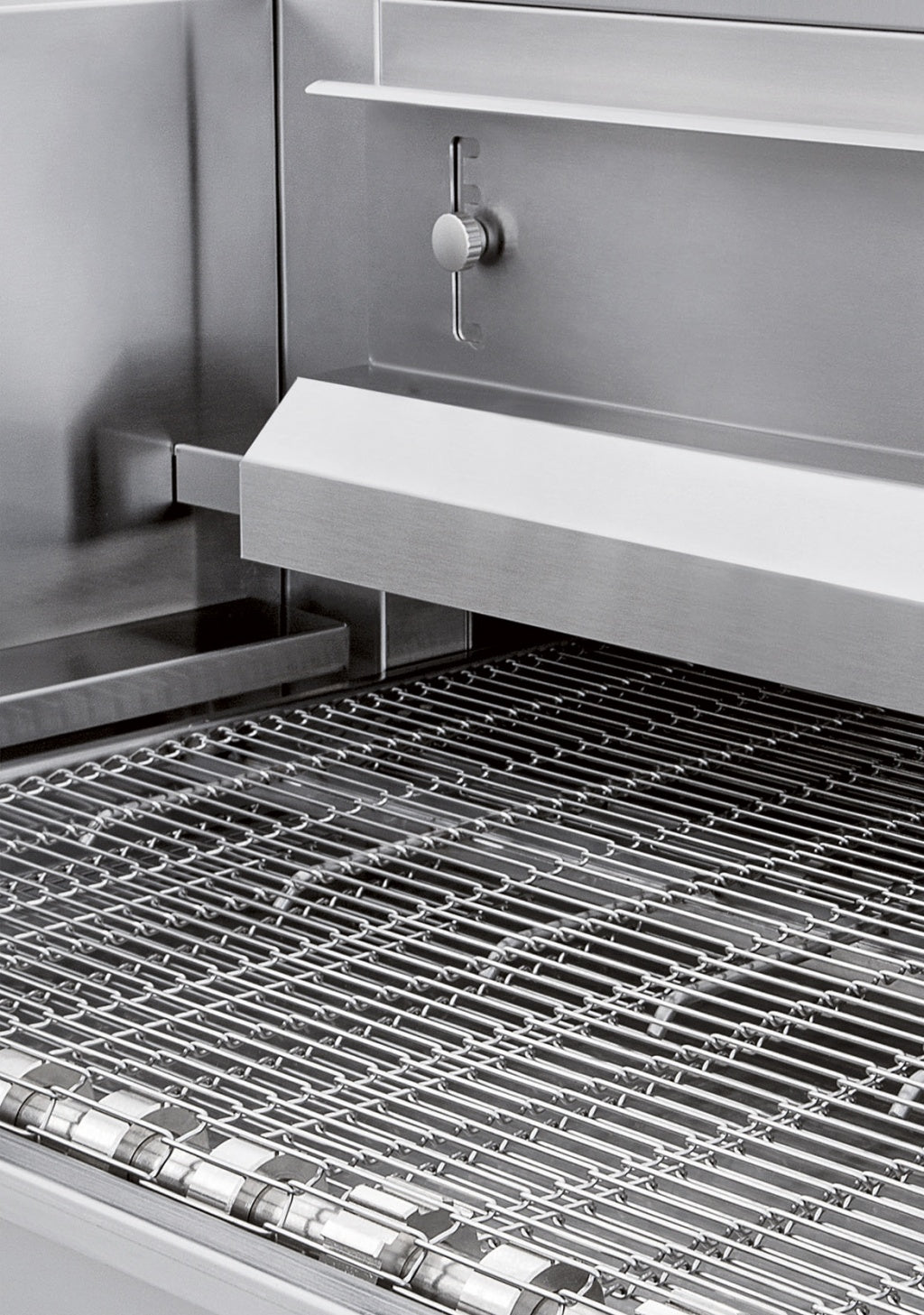 - Increased productivity thanks to the conveyor belt and the convection cooking