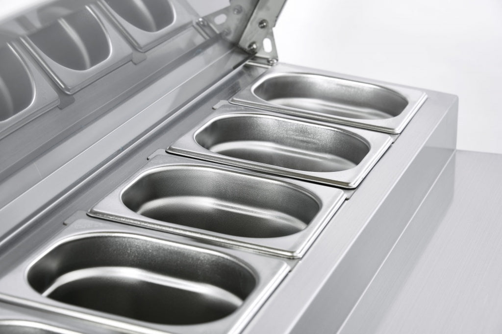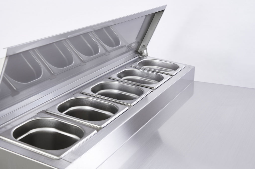 The Sterling Pro SPU200PZ pizza prep counter is designed to store fresh topping ingredients in a convenient and safe unit behind the worktop making it easy to create the perfect pizzas. The catering-grade stainless steel construction is durable and extremely easy to clean. Featuring a powerful fan-assisted system the SPU200PZ will keep your ingredients at the perfect temperature even during busy hours.