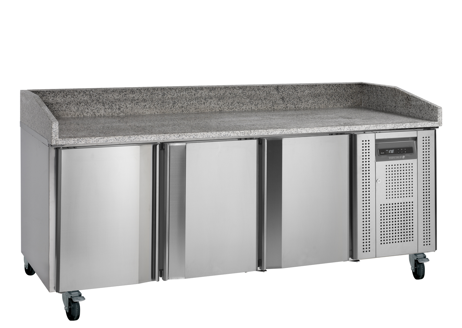 The PT1300 pizza table offers a durable and functional addition to any commercial kitchen. Constructed from stainless steel, it features guides for 7 pizza trays in each of the three doors (400x600 mm) and a granite worktop for easy preparation. With ventilated cooling and automatic defrost, it ensures hassle-free operation. The self-closing doors and adjustable legs add to its convenience and adaptability, making it a practical choice for commercial kitchens. With its sturdy construction and thoughtful design, the PT1300 pizza table is built to withstand the demands of a busy kitchen environment.