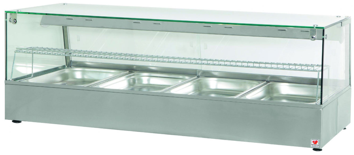 This HDW4 counter top heated display is ideal for displaying a range of hot food requiring humidity. It is fitted with a slide out humidity tray to prevent products drying out and overhead halogen heat lights for additional heat for products on the top shelf. Electric air-heated showcase with curved glass and moisture drawer for food maintenance. The heating happens with halogen lamps and its adjustable temperature can reach up to 90C. It also provides hot air circulation and humidity in the chamber for greater freshness of the heated products, ideal for heating chicken