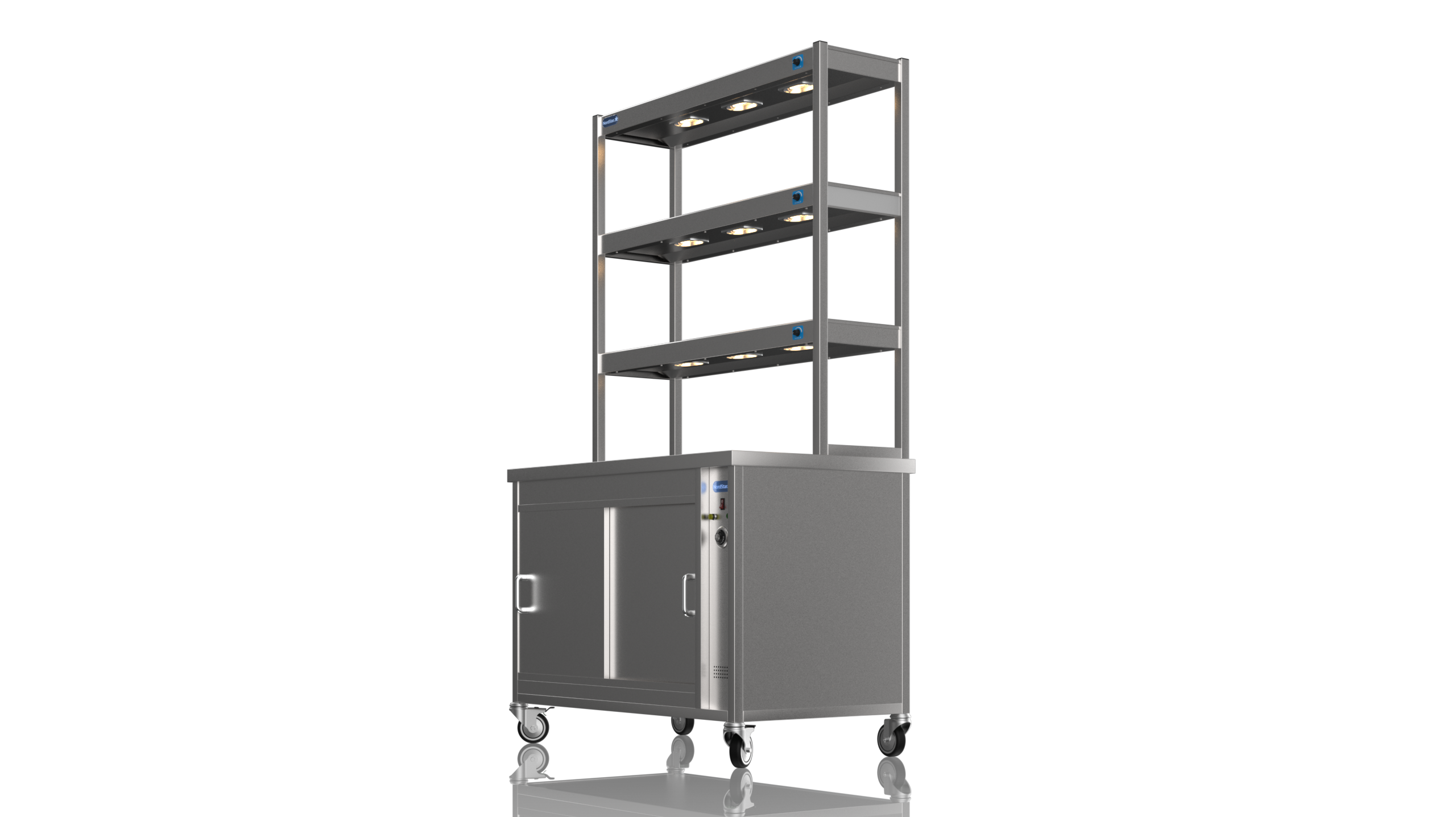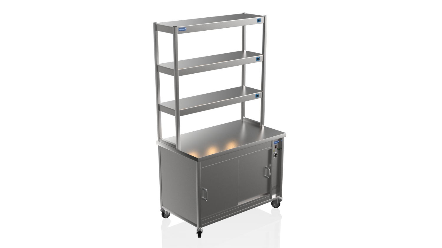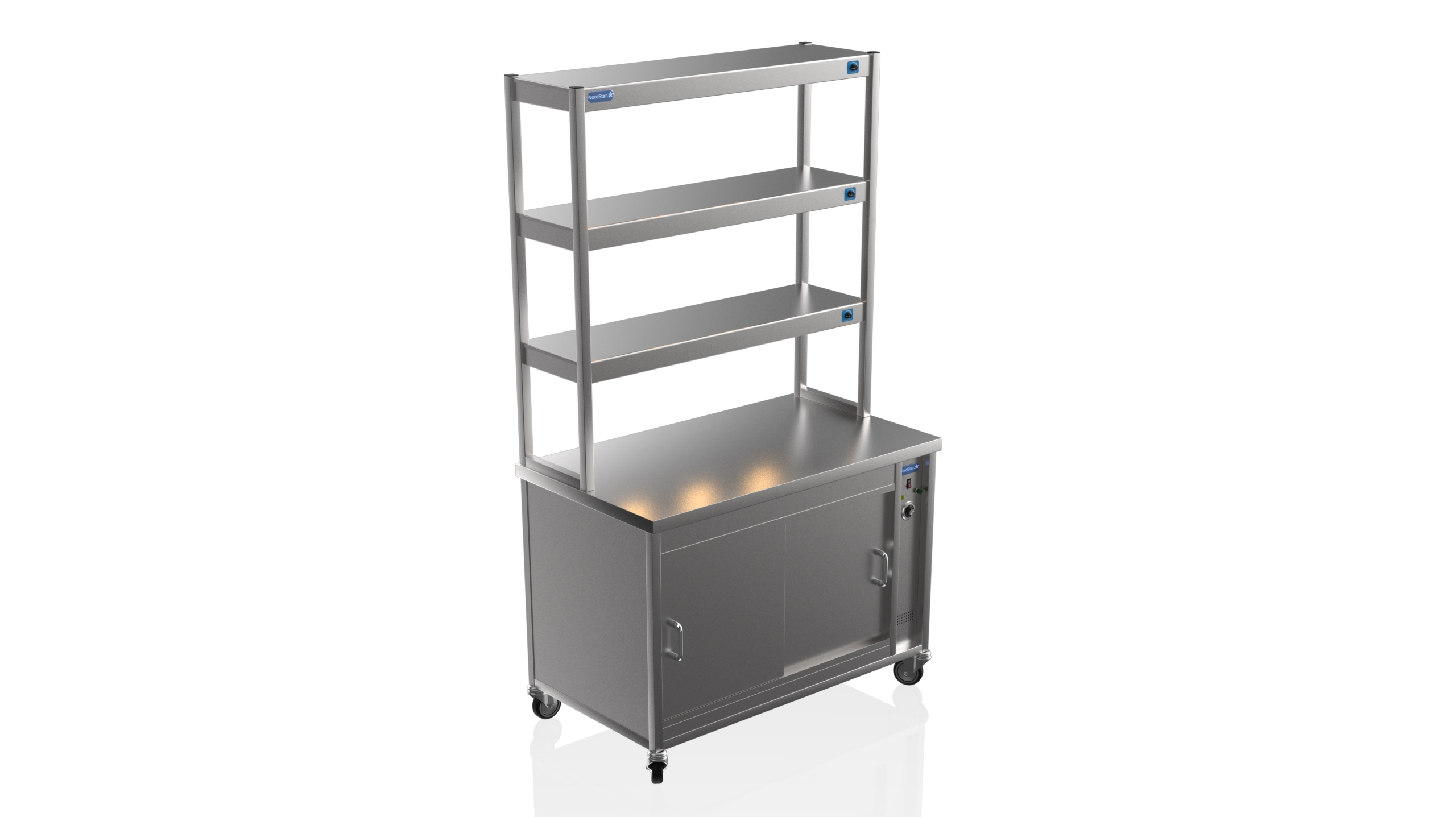 The Nordstar 3 Tier Combo 1200 Nord Star Hot Cupboard with three Tier Gantry Hot Cupboard is a high quality, reliable appliance, ideal for care homes, restaurants and canteens. Constructed with easy to clean stainless steel, contents are kept at warm and hygienic temperatures due to its fully insulated panels,  easily accessible using our own sliding door system.