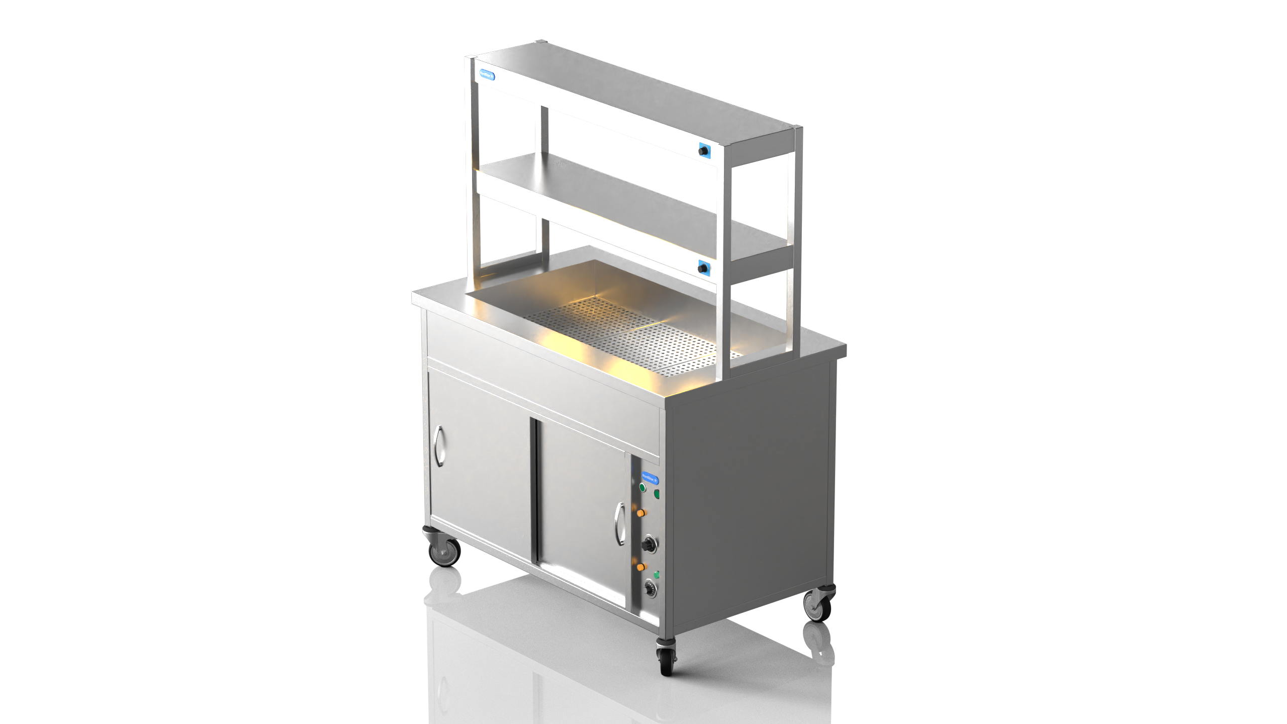 It also features a simple thermostat control for the hot cupboard, simmer stat control for the bain marie. comes complete with castors. can be fitted with tray slide and sneeze guard at your request. Gastro pans can be bought seperately