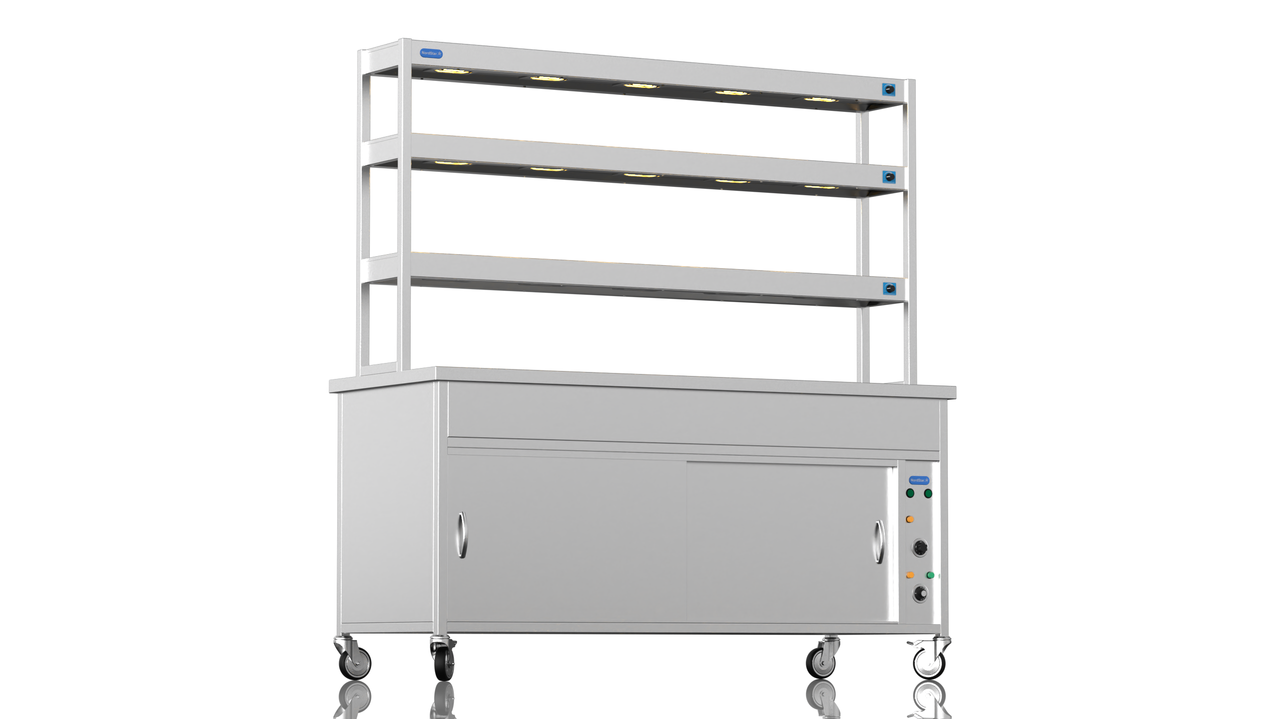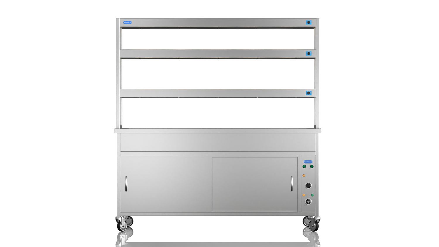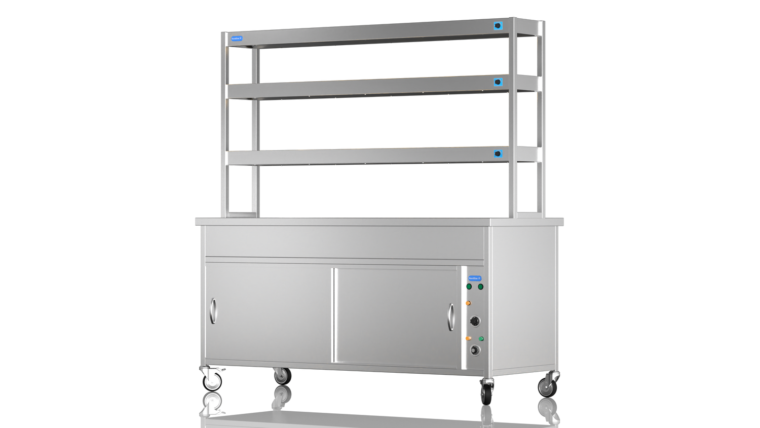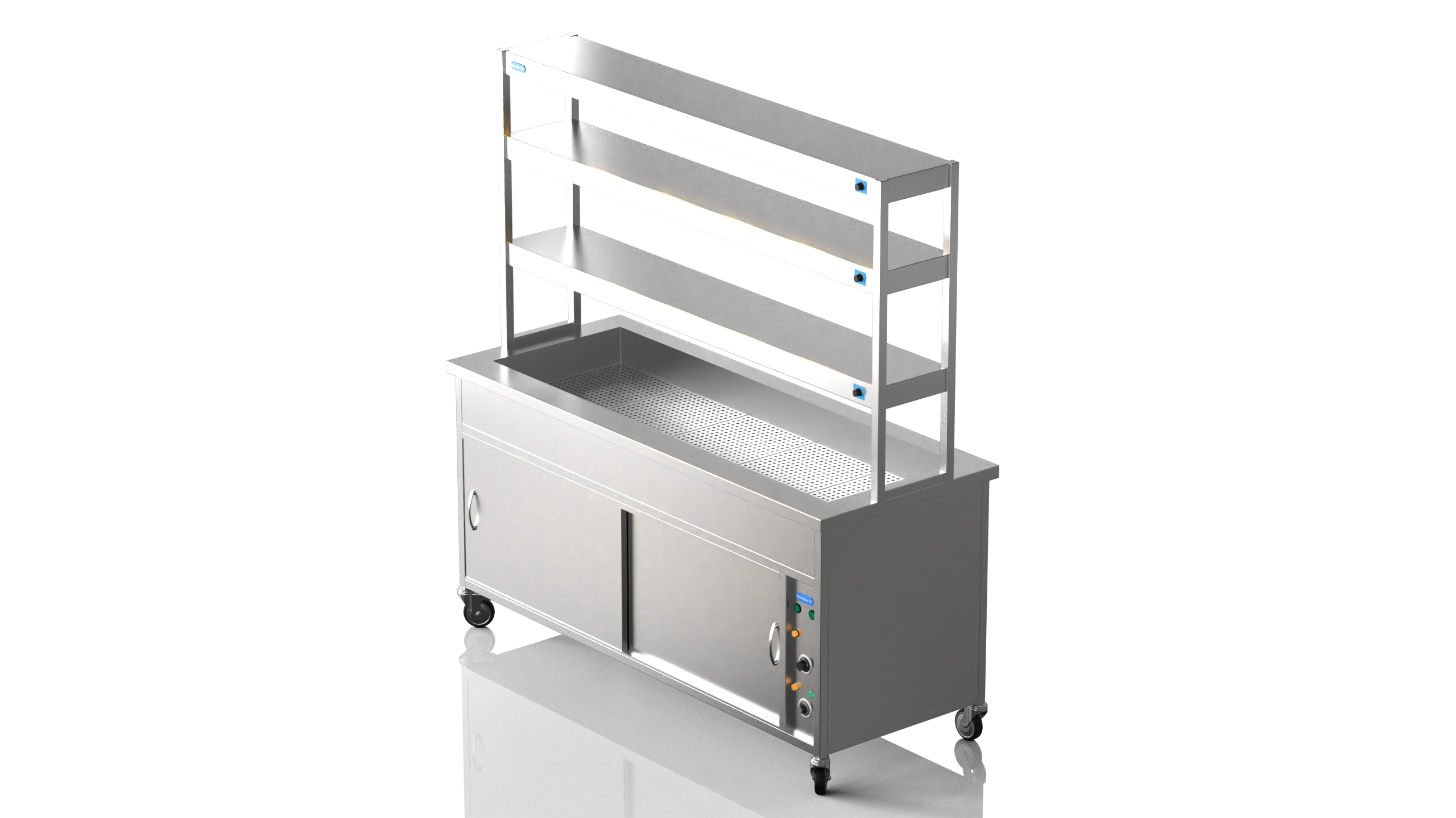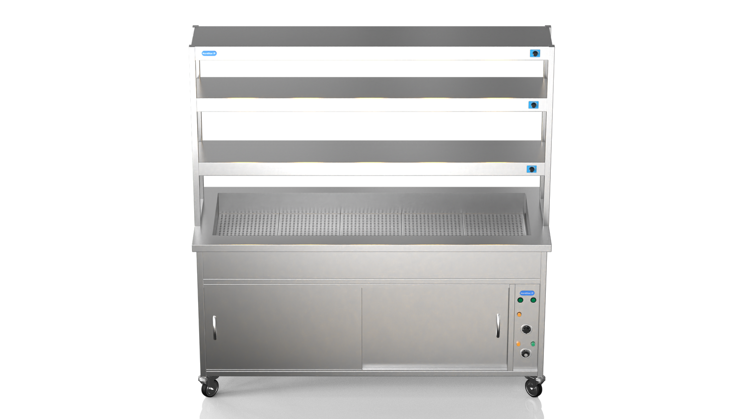 The independently controlled dry heat bain marie top allows flexible pan configuration — ideal for serving a variety of meals, side dishes, or specialized dietary options. Key Features: Accommodates 5 x 1/1 GN pans – Serve multiple dishes simultaneously Dry heat operation – Quick heating, easy maintenance Three-tier heated gantry –