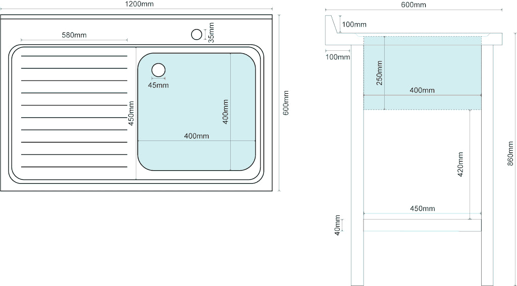 This sink comes complete with corner drainer and strainer. The 38mm square legs have adjustable feet and are stepped in 100mm from the back to allow for pipework. Finishing off the sink is a stainless steel valance for a clean, professional look. Also included is a stand pipe.