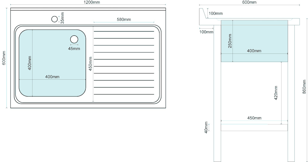 This sink comes complete with corner drainer and strainer. The 38mm square legs have adjustable feet and are stepped in 100mm from the back to allow for pipework. Finishing off the sink is a stainless steel valance for a clean, professional look. Also included is a stand pipe.