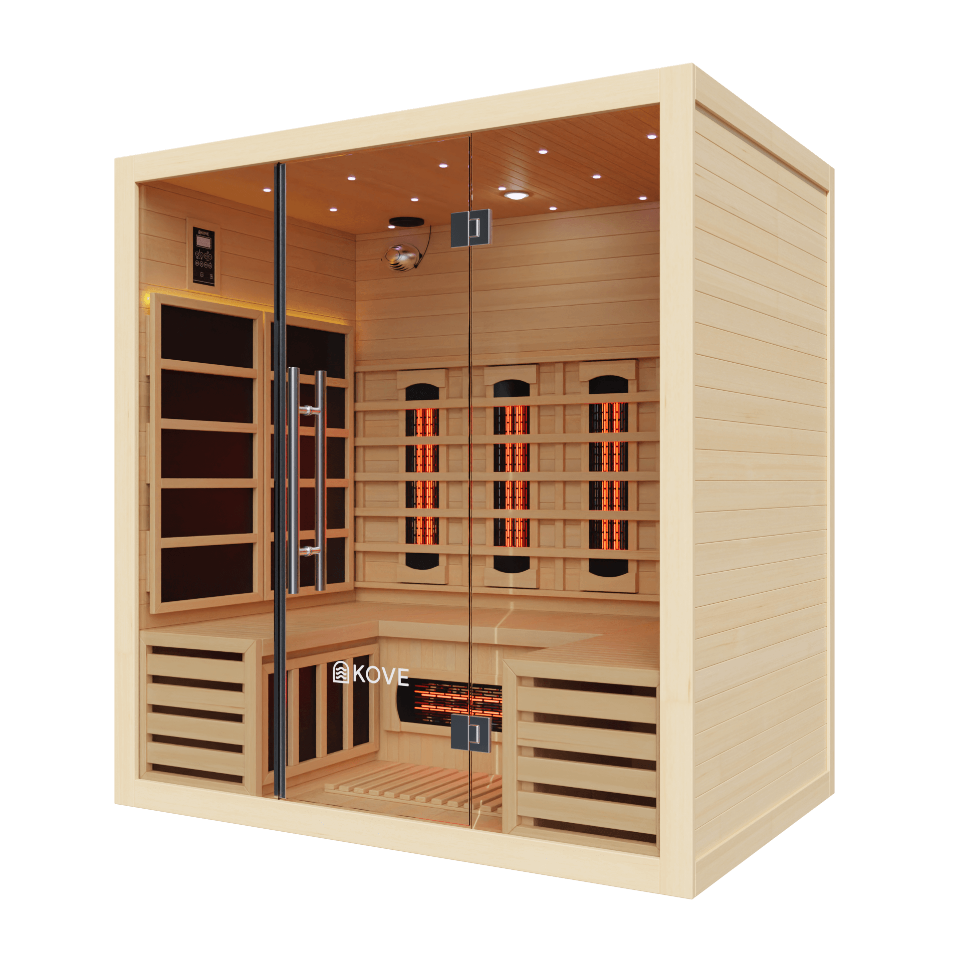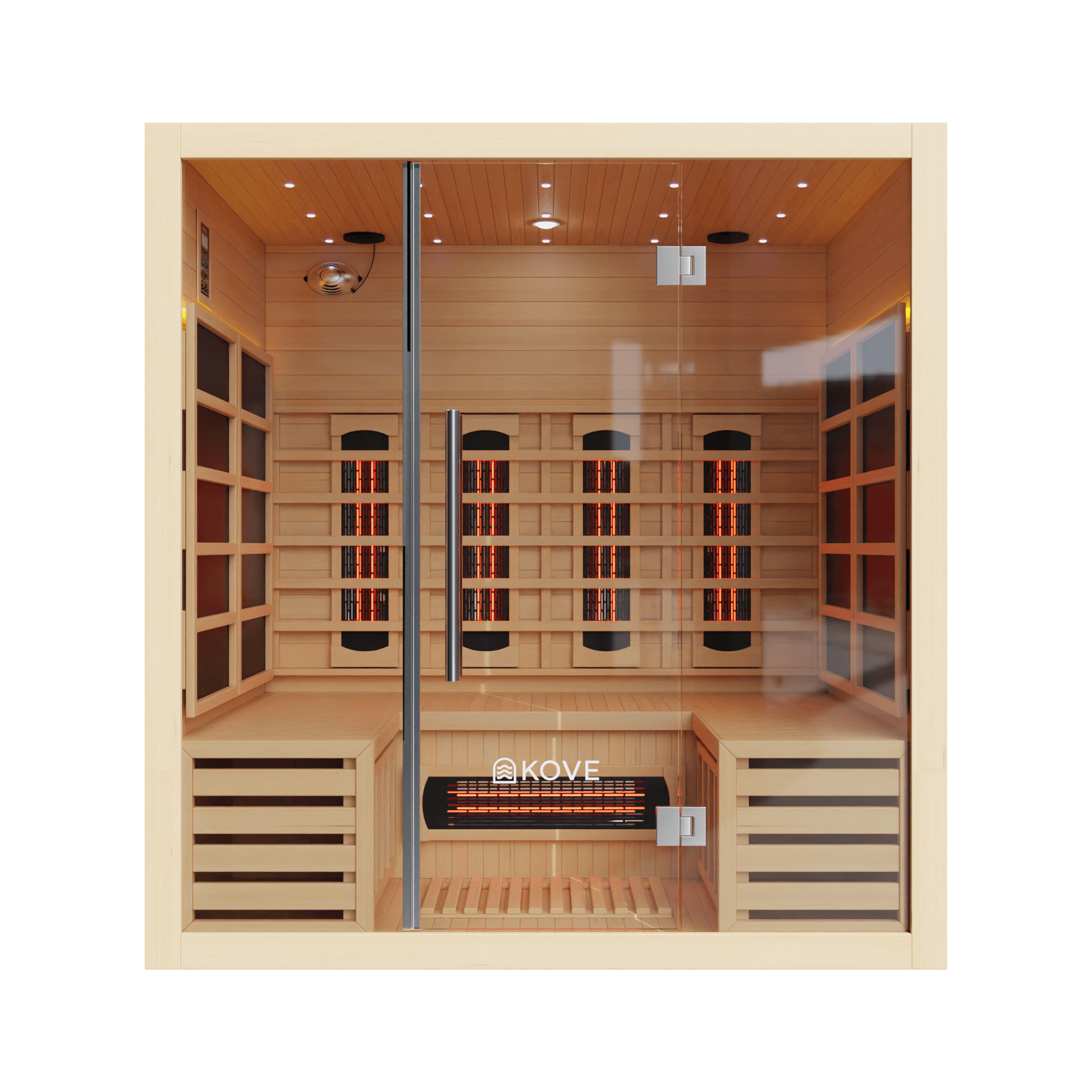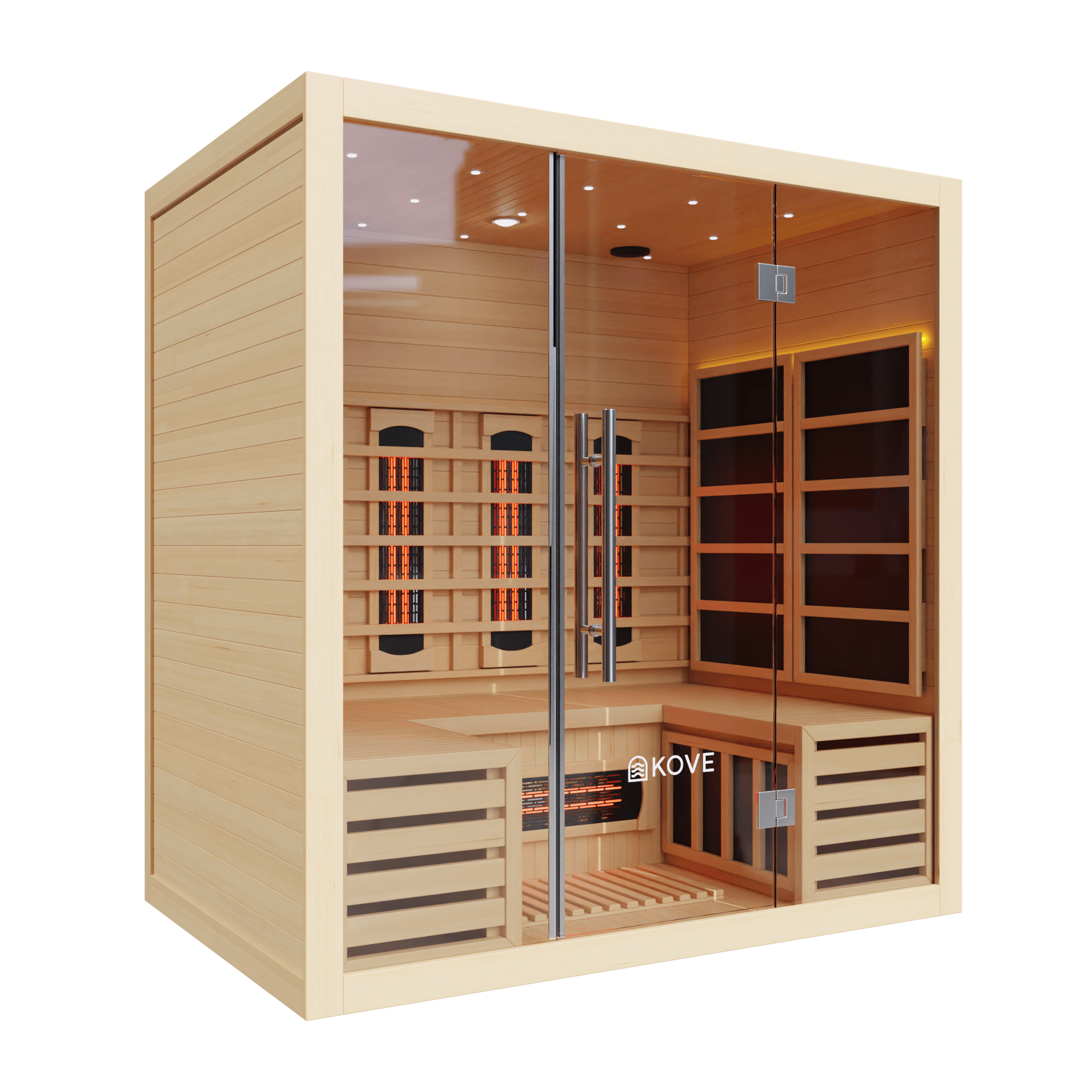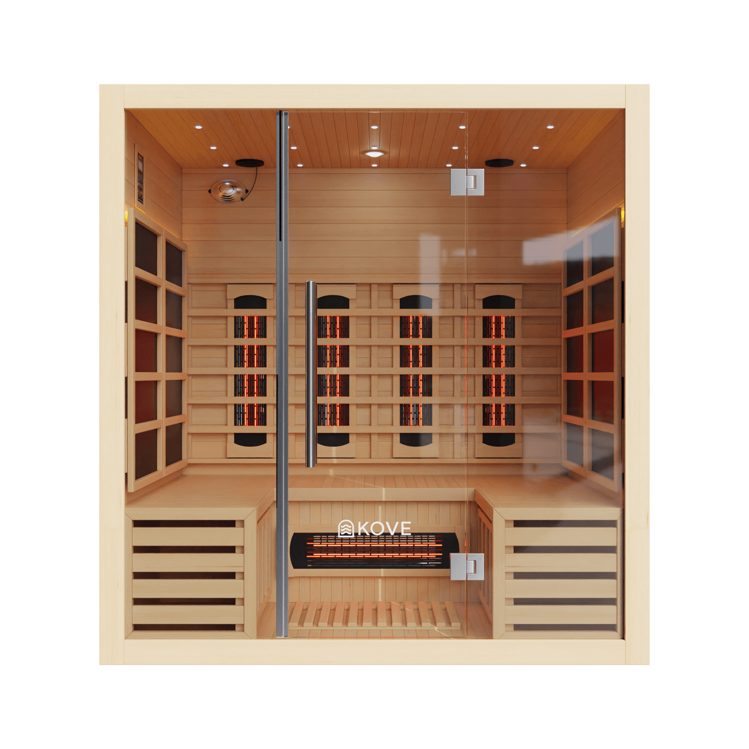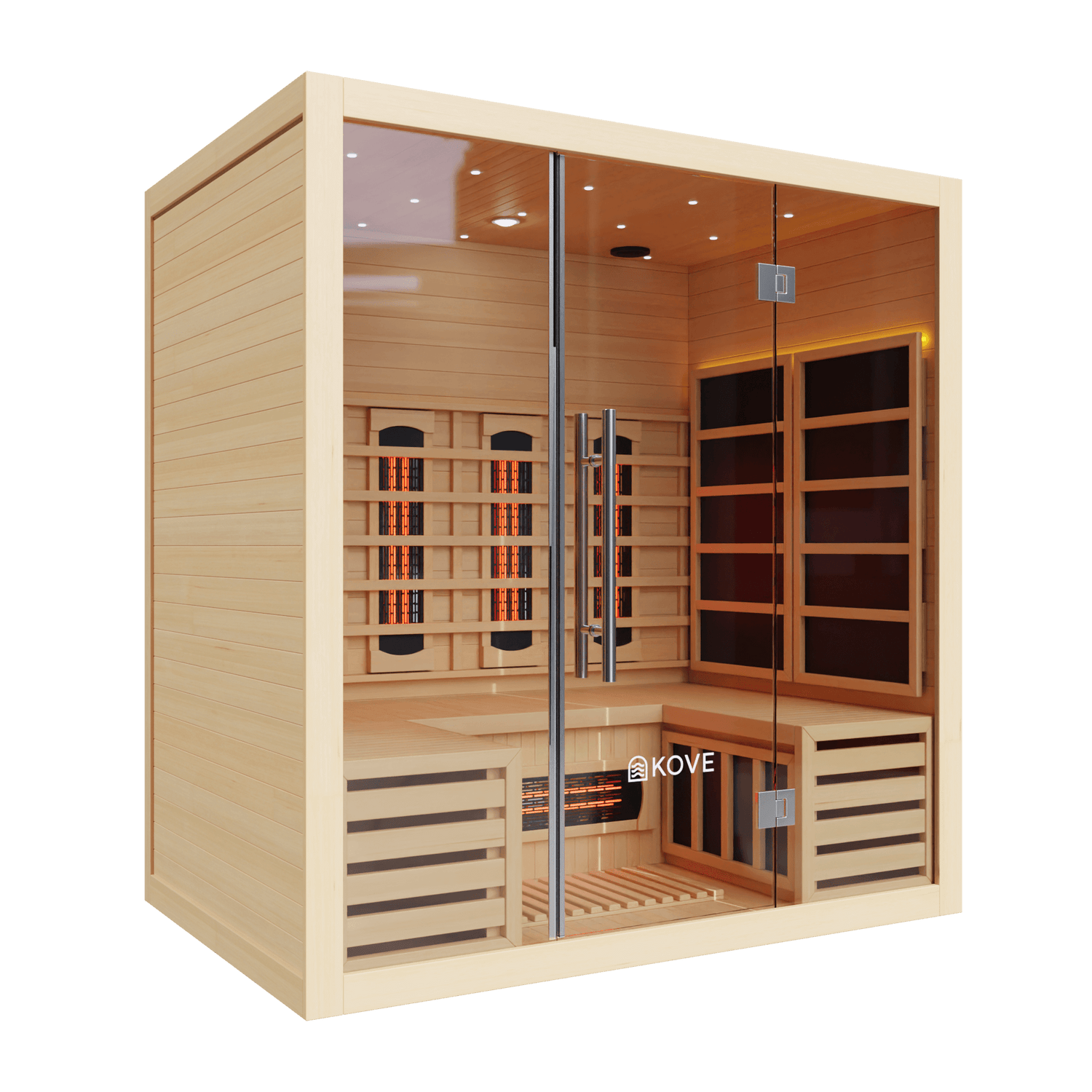 The KOVE 4-person sauna features a true full spectrum infrared heating system, carefully laid out to deliver consistent, full-body heat across a larger internal space: