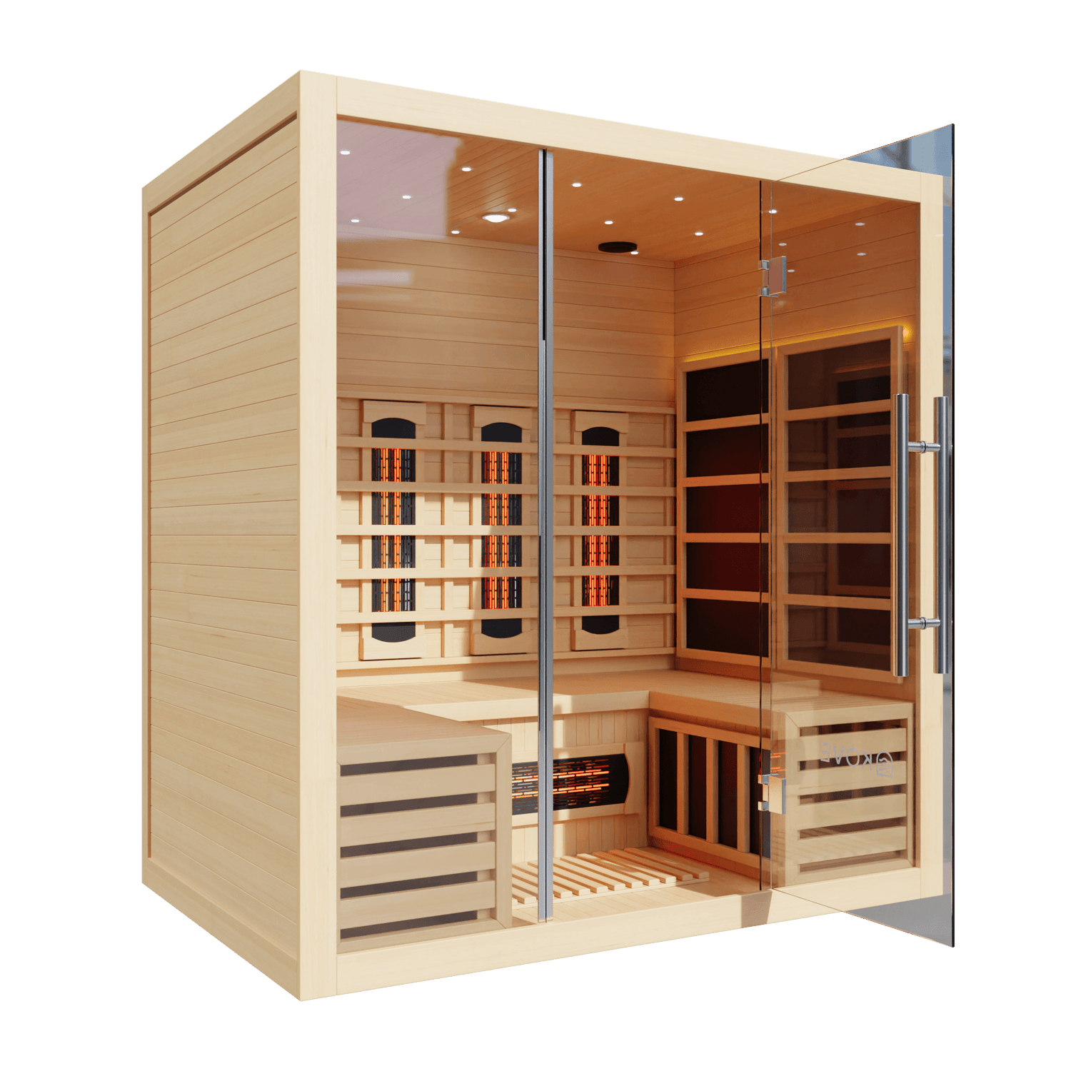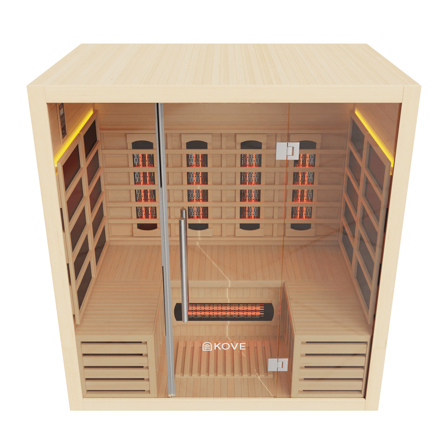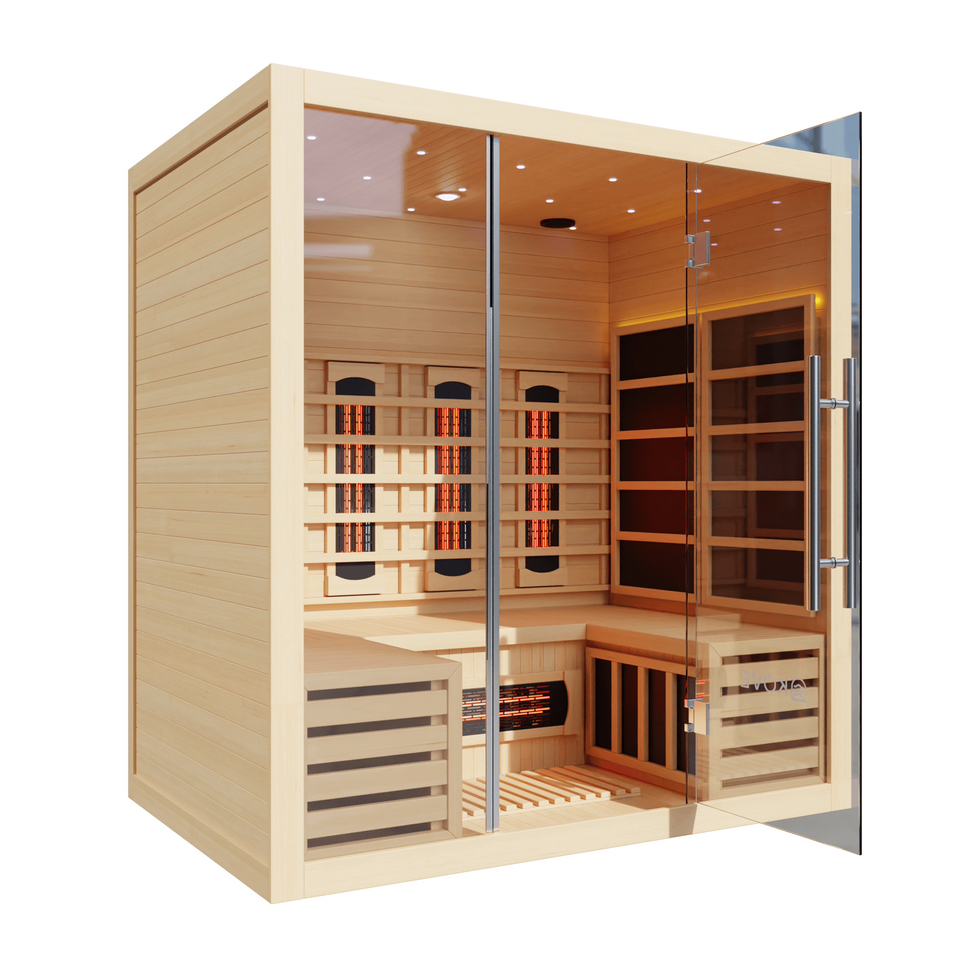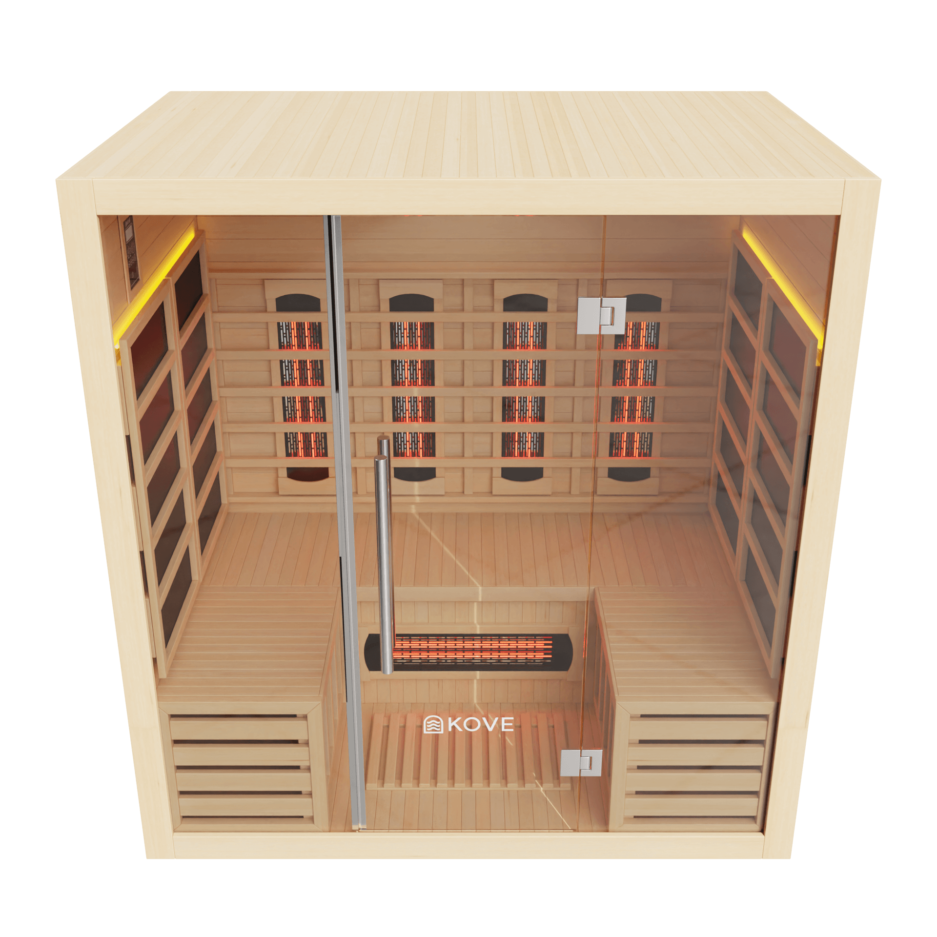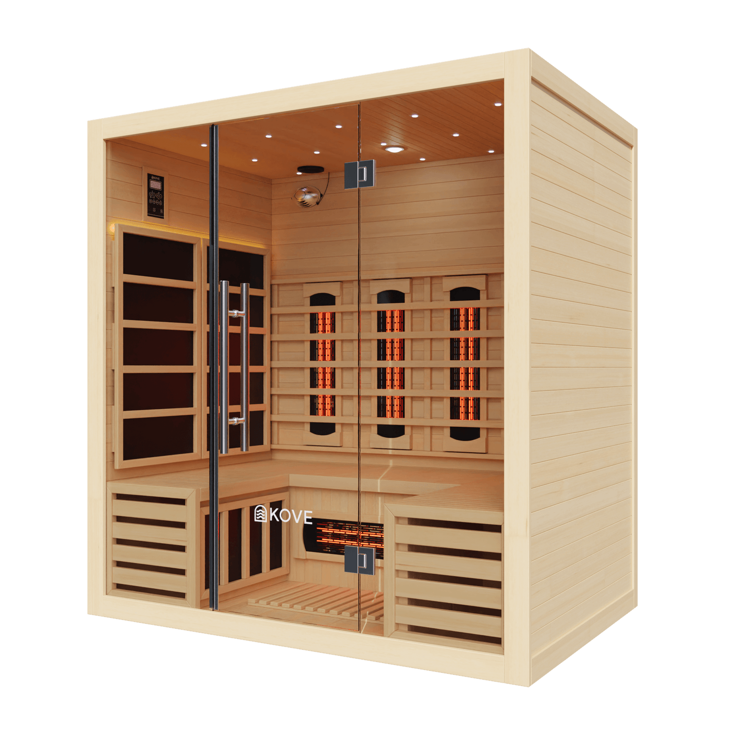 The KOVE 4-person sauna features a true full spectrum infrared heating system, carefully laid out to deliver consistent, full-body heat across a larger internal space:
